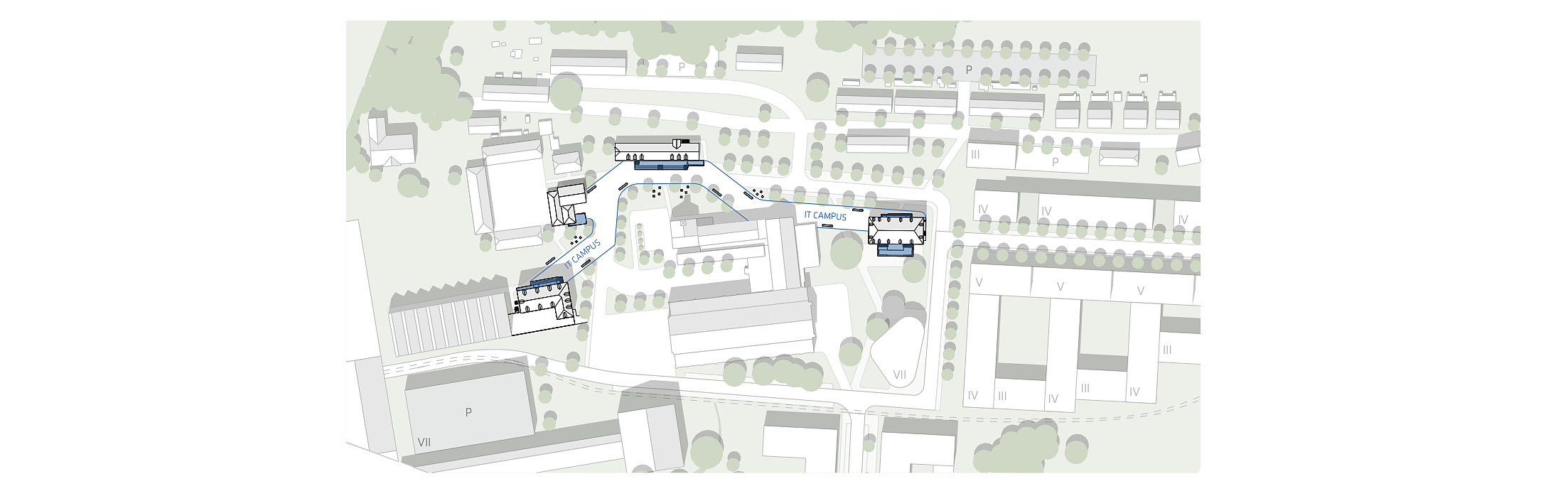Four industrial monuments of the "Alte Schmelz" in St. Ingbert together form the IT campus planned by RaumstarArchitekten. Approximately 180 modern office workplaces will be created here. The design approach for the ensemble, which is listed as a historic monument, aims to make the interplay of the individual buildings and a sense of togetherness between their users tangible in the outdoor space. The focus here is in particular on the historic access staircases, which in their current form do not meet today's requirements for building access. Another focus is the creation of a campus situation. After revitalization, the buildings will accommodate offices whose users will develop a sense of community across the four buildings. To achieve this, the "campus" image in the exterior is one of the design principles. The idea is to keep the historic exterior stairways visible and usable as much as possible. Additions that comply with today's building code regulations will complete the stairways. These building code additions are simultaneously used and expanded to place staging areas in front of the buildings for users to stay and interact with the outdoor space. Where possible, these outdoor landings nestle up against the historic staircases, contrasting the old and the new. This approach can be repeated on all the buildings, creating the desired interplay between the individual monuments. To the northwest of the IT campus is the newly created MINT Campus. A glass addition to the gatehouse will create a portal to the campus. A possible new building in the south of the MINT Campus forms a protected courtyard and provides space for newly established initiatives.